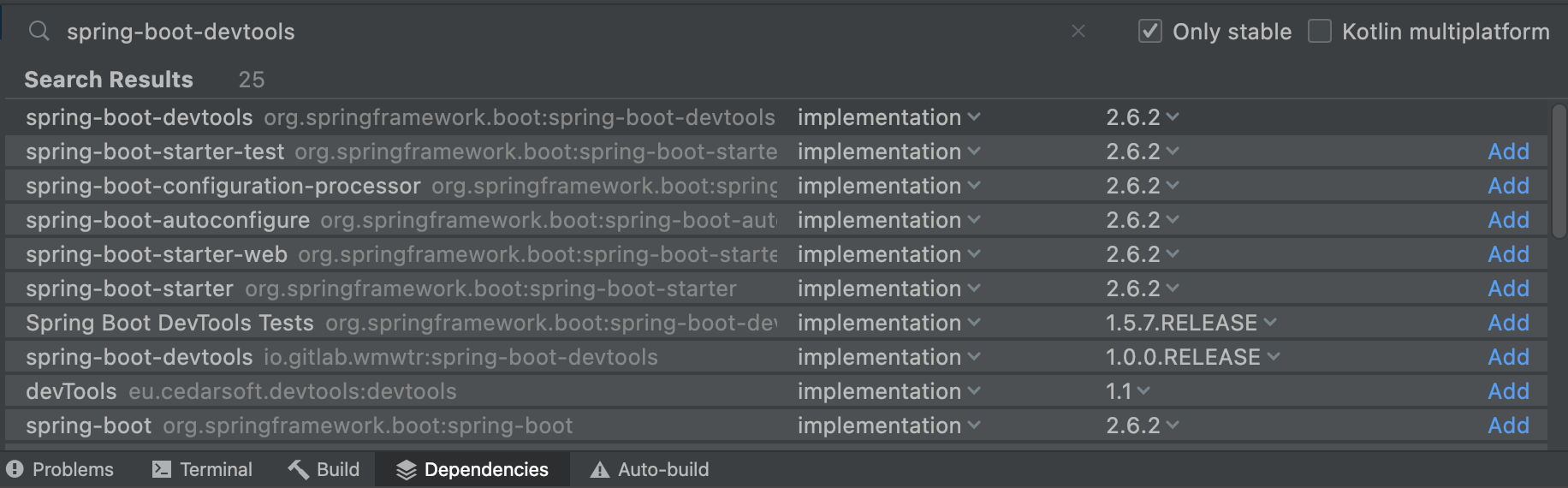 Dependencies에서 spring-boot-devtools 검색 후 Add 버튼으로 의존성 추가