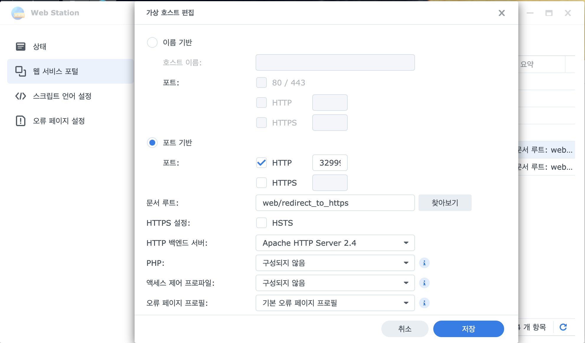 대상포트와 3번의 Web Station 의 포트를 동일하게 해줘야한다